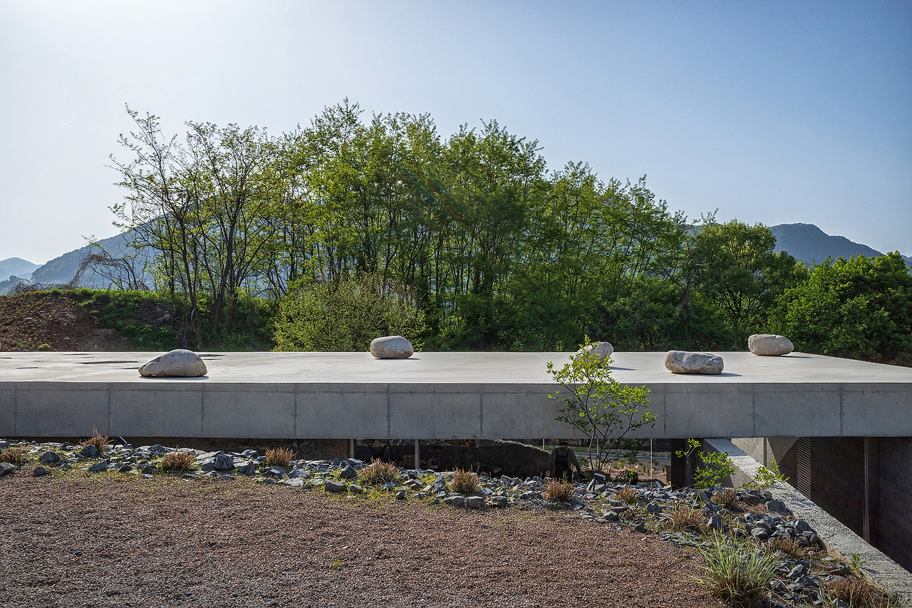 단순하지 않다. 콘크리트를 통해 이어진 통로는 지하로 향하는 듯하기도 하고, 지상으로 올라가 드넓은 풍야를 보여준다. 적절한 그림자와 빛의 세기 그리고 그걸 비추고 있는 건축물의 선과 면. 인간 대신 모든 스트레스를 흡수하는 것만 같았다. 청풍호에서 들러오는 물의 소리와 언덕 위의 나무들의 잎의 소리는 굳이 이곳이 음악이 필요하지 않음을 충분하게 보여준다.