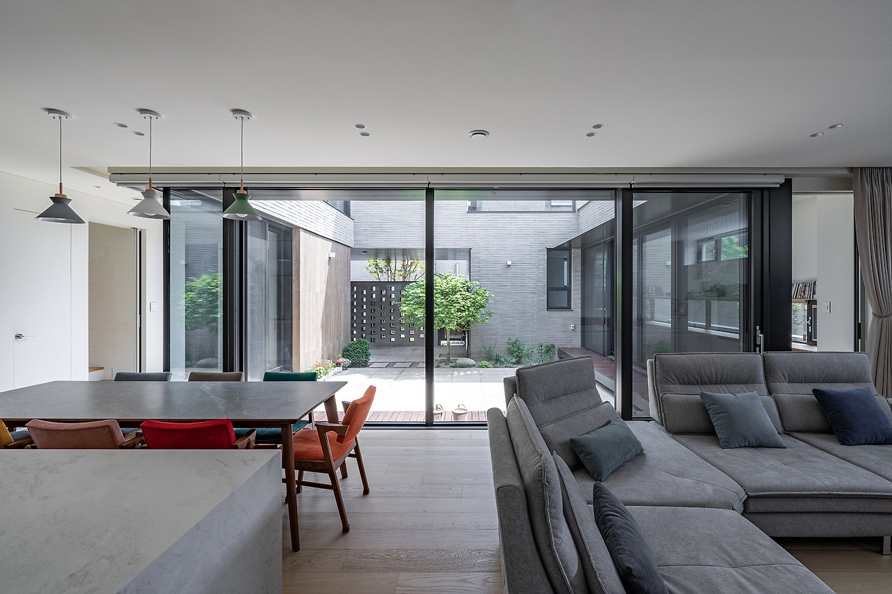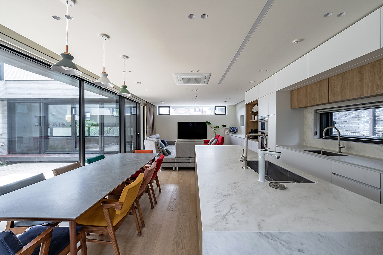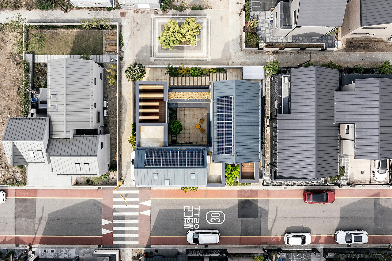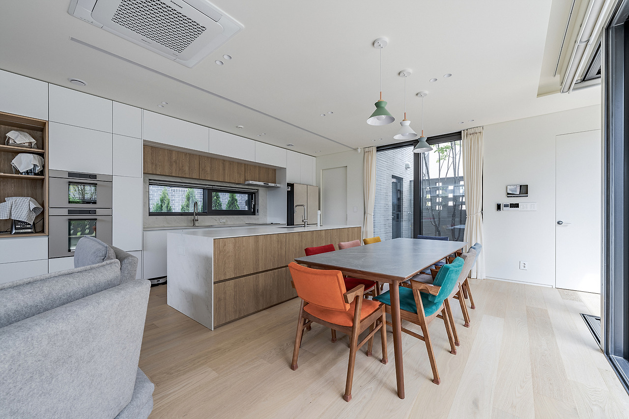 지난해에 준공된 이 집은 여러 가지 이유로 준공 사진 촬영 시기가 미뤄져 올해 2024년 장마 시기를 앞두고 사진을 촬영하게 됐다. 사연이야 깊지만 더 이상 미룰 수 없는 상황 때문에 흐린 날씨에 카메라 장비를 꺼내들어 건축주에게 방문했던 기억이 지금도 생생하게 난다. 그 이유는 지난해에 촬영이 늦어진 이유에 날씨 영향이 포함됐기 때문이다. 이 일을 그렇게 오래 하진 않았지만 날씨의 영향과 그날의 상태가 결과물의 대부분을 결정짓는다는 것에 쉽지 않은 일임을 일깨운다. 오늘의 빛은 따스하거나 맑진 않지만 흐린 빛 특유의 부드러움과 건축물과 하늘이 하나가 될 수 있는 장면이 종일 지속되기 때문에 상황을 피할 이유 또한 없다.