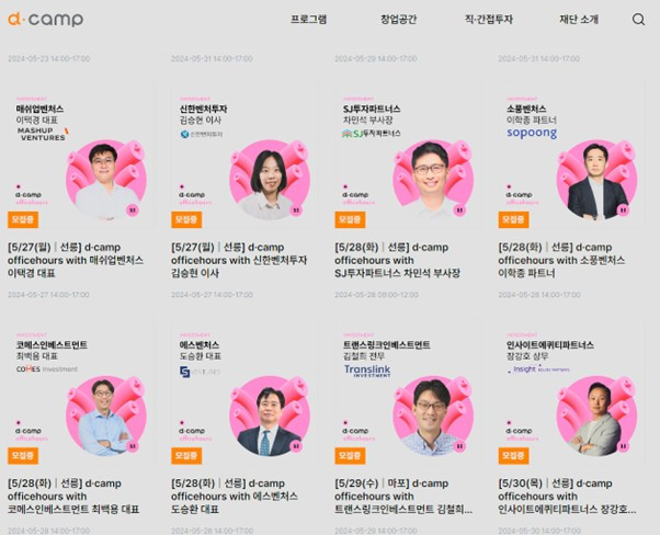 디캠프(https://dcamp.kr)의 '오피스아워'는 VC 등과 멘토링을 주선해주는 프로그램이다.