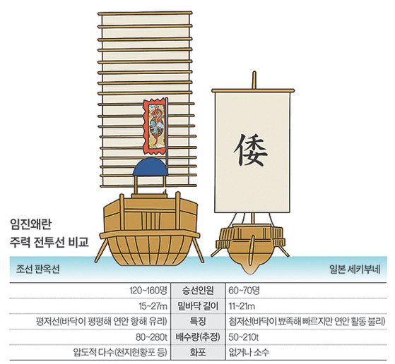 판옥선은 길이 약 35미터, 폭 10미터로 세키부네보다 훨씬 크고 안정적이었을 뿐만 아니라,