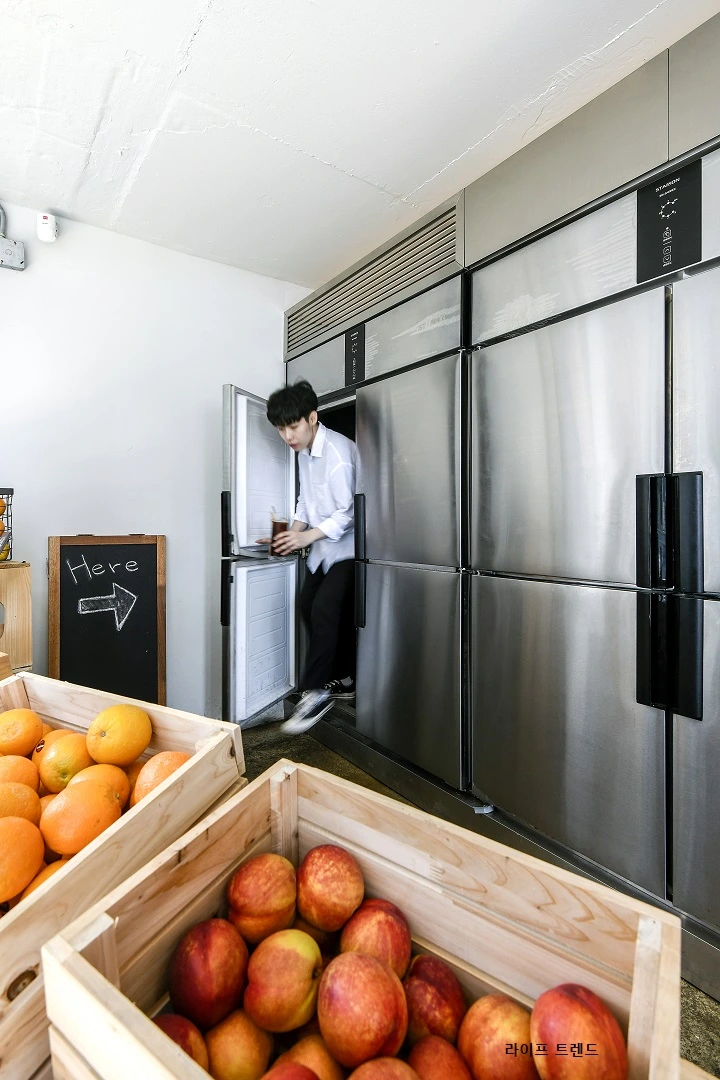 지난해 서울 광희동에 냉장고처럼 입구를 꾸민 ‘장프리고’가 문을 열었다. 언뜻 보면 동네 작은 과일가게처럼 보이지만 냉장고 문 뒤로는 전혀 다른 분위기의 공간이 펼쳐진다. 방문자는 한쪽 벽면에 놓인 냉장고 문을 열어야 좌석이 있는 실내로 들어갈 수 있다. 간판이 없고 ‘싱싱한 과일 판매합니다’라는 글귀만 적혀 있어 처음 오는 사람은 지나치기 쉽다. 하지만 낮에는 카페, 밤에는 바로 운영되는 곳이다. 장지호 장프리고 대표는 “주거지역에 위치한 만큼 지역 주민과 함께 융화할 수 있는 공간을 만들고 싶었다”며 “냉장고 문 앞은 과일가게, 문 뒤쪽은 평소 생각한 분위기의 바를 만들었다”고 설명했다.