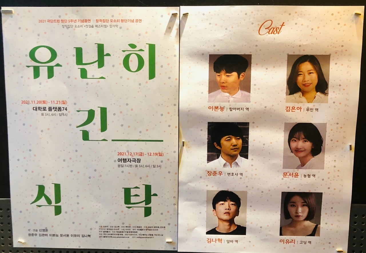 처음에는 제목이 모든 것을 말해주는 연극이라 생각했다. 가족이 있고, 그들 간의 마음의 거리를 긴 식탁으로 표현했으리라. 가족은 사실 가장 가깝지만, 가깝다고 믿는 만큼 서로에게 무지하지 않은가. 하지만 연극은 나의 예상과 정반대의 상황을 전개한다. 한 번도 상상한 적 없는 가족이 등장하고, 그들은 보통의 가족보다도 서로 하나로 연결되어 있다. 긴 식탁이 연극 무대의 전부지만, 마치 긴 끈처럼 식탁은 서로를 연결해주고 있다.