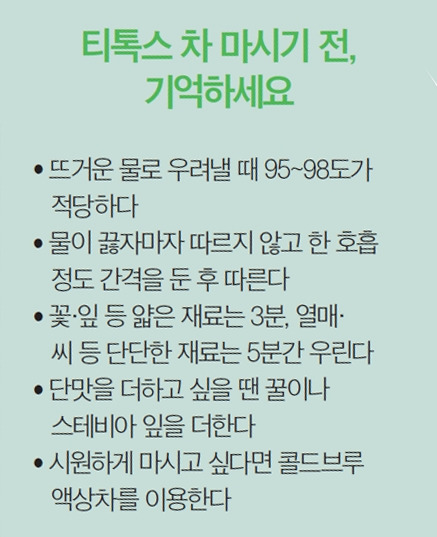 티톡스 차 종류가 다양한 만큼 주의점도 있다. 차의 원료로 쓰이는 허브는 재료마다 성질과 효능이 달라 마시는 목적과 체질에 맞는 원료인지 확인해야 한다. 생강과 계피가 들어간 차는 혈액순환을 돕고 몸을 따뜻하게 하기 때문에 평소 몸이 찬 사람에게 적합하지만 몸이 뜨겁고 열이 많이 나는 임신부는 피하는 게 좋다.