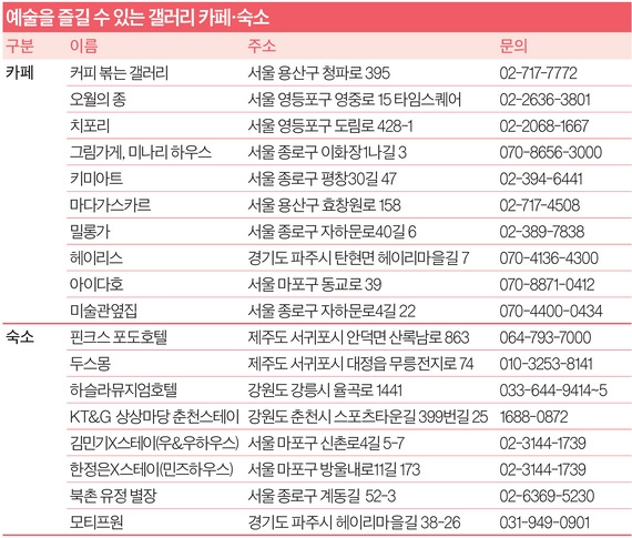 예술작품이 미술관 밖으로 나왔다. 누구나 쉽게 찾을 수 있는 카페·숙소가 예술작품을 관람할 수 있는 공간으로 바뀌고 있다. 커피 한잔 마시며 조각 작품을 천천히 둘러보고, 가족과 함께 찾은 숙소에서 벽에 걸린 그림을 하루 종일 감상할 수 있다. 문턱 높게 느껴졌던 예술작품이 일상 속으로 깊숙이 들어왔다.