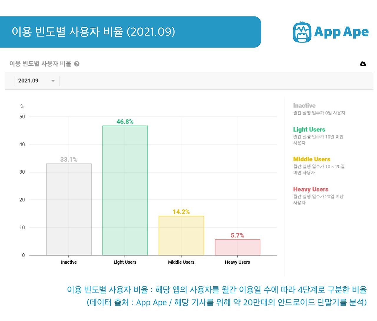 해당 콘텐츠에 데이터를 제공한 앱에이프는 일본의 빅데이터 처리 기술력을 바탕으로 한국에서 출시된 대부분의 앱에 대한 데이터를 제공합니다. 60개 이상의 상세 지표는 모바일 시장 상황 및 소비자·경쟁사 분석과 마케팅 전략 도출에 유용하게 사용될 수 있습니다.