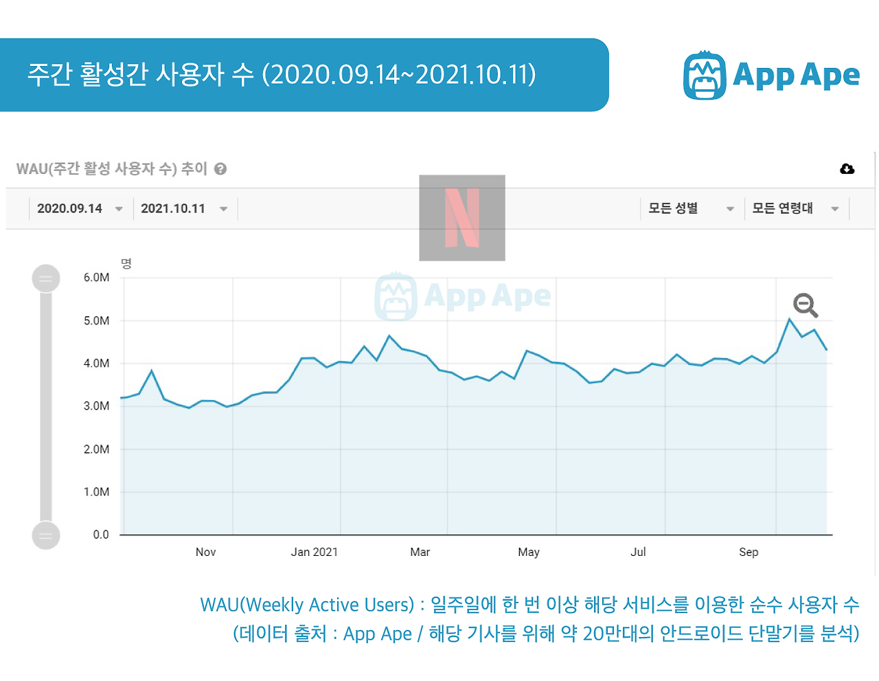 <’넷플릭스’ 앱의 WAU 추이(2021.9.14 – 2021.10.4)/안드로이드, 출처: App Ape>