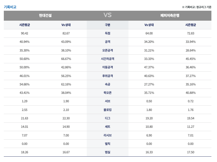 기록으로 봐도 금세 알 수 있습니다. 팀 기록을 보면 3번 경기를 치를 동안 득점은 142대 199로 페퍼가 57개 적고 공격 성공 수도 40개 적어요. 세트성공 수도 41개로 많이 모자라고 디그도 조금 아쉽습니다. 그러나 블로킹, 범실, 리시브정확은 아주 약간씩 못 미치는 수치예요. 크게 차이 나는 기량이 아니라고 봅니다.