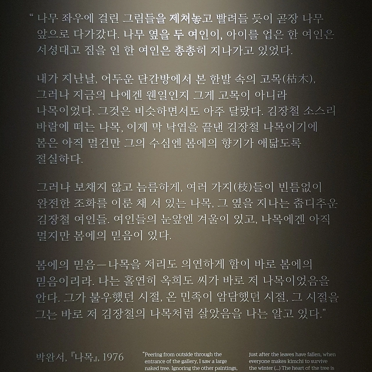 가리워진 듯 언뜻언뜻 보이는 그림들 속엔 아이를 업은 소녀, 빨래터의 여인들, 아이를 업고 절구질하는 여인 등 화자가 마주했던 일상 속 인물들과 나목이 그려져 있다. 얼핏 보면 쓸쓸하고 힘겨워 보이나, 잘 보면 그 안에 희망이 담겨 있는 듯하다. 겨울 지나고 봄이 오면 연둣빛 잎과 분홍빛 꽃을 틔워낼, 봄의 전령으로서 나목의 모습. 그 앞에 선 화자의 마음을 헤아리다, 왠지 그것은 한숨과 뒤섞인 사랑, 애틋함, 애잔함, 슬픔, 희망과 같지 않을까 싶어, 잔잔하고 뭉클한 감동이 일어 온다.