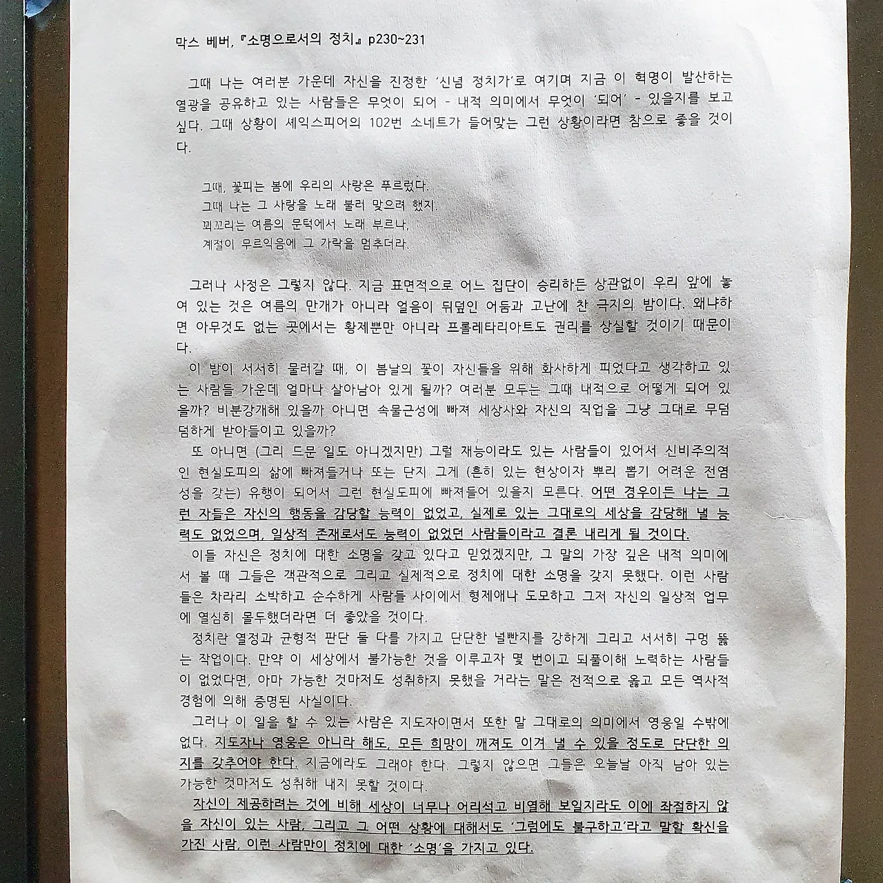 싱크대 찬장에 붙은 『소명으로서의 정치』 마지막 부분 발췌