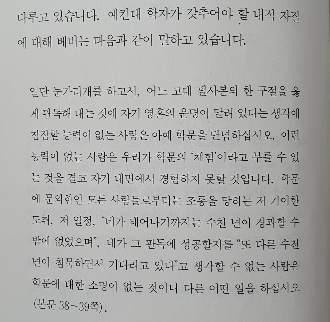 "어느 고대 필사본의 한 구절을 옳게 판독해 내는 것에 자기 영혼의 운명이 달려 있다는 생각에 침잠할 능력이 없는 사람은 아예 학문을 단념하십시오." - 막스 베버, 『직업으로서의 학문』 중.