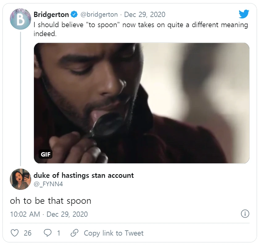 유명해진 숟가락이 하나 있다. 사이먼이 숟가락을 아주 유혹적으로 핥는 장면이 나오는데, 아주 많은 시청자가 운 좋은 숟가락이라며, 그 숟가락이 되고 싶다며 난리를 쳤다. 다프네도 그 모습을 아주 빤히 쳐다본다. 눈썹을 파르르 떨면서. 혀뿐만 아니라, 다프네는 사이먼의 근육도 아주 흑심을 제대로 담아 본다. 윌 몬드리치의 경기 중 사이먼이 소매를 걷어붙이자 다프네는 사이먼의 팔 근육에 시선을 떼지 못한다. 이 장면을 슬로우 모션에 클로즈업으로 제대로 보여준다. 첫날밤에도 사이먼이 옷 벗는 모습을 빤히 바라보고, 다 벗고 나서도 가슴에 시선을 못 뗀다. 남성의 성적인 모습을 향해 자연스럽게 따라가는 여성의 시선을 카메라가 착실하게 따라가준다. 정말이지 이 작품은 너무나도 솔직하다.