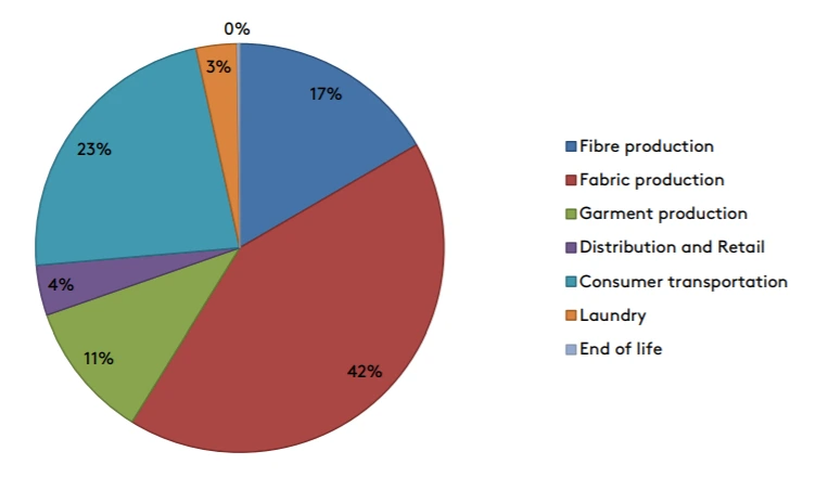 Sandra Roos 외 3명, 「Environmental assessment of Swedish fashion consumption」위 그래프는 스웨덴에서 의류 제품의 전과정평가(Life Cycle Assessment, LCA)를 진행한 결과로, 각 단계별로 기후변화에 대한 영향을 나타낸 자료입니다. 전과정평가(LCA)란, 제품의 원재료 생산 단계에서부터 제조, 가공, 유통, 사용, 폐기에 이르기까지의 모든 과정에서 나타나는 환경적 영향에 대해 분석하는 것을 말합니다. 위 자료에 따르면, 소비자 배송 단계가 기후변화에 미치는 영향은 모든 과정에서 발생하는 영향의 4분의 1을 차지합니다. 두번째로 크죠.
