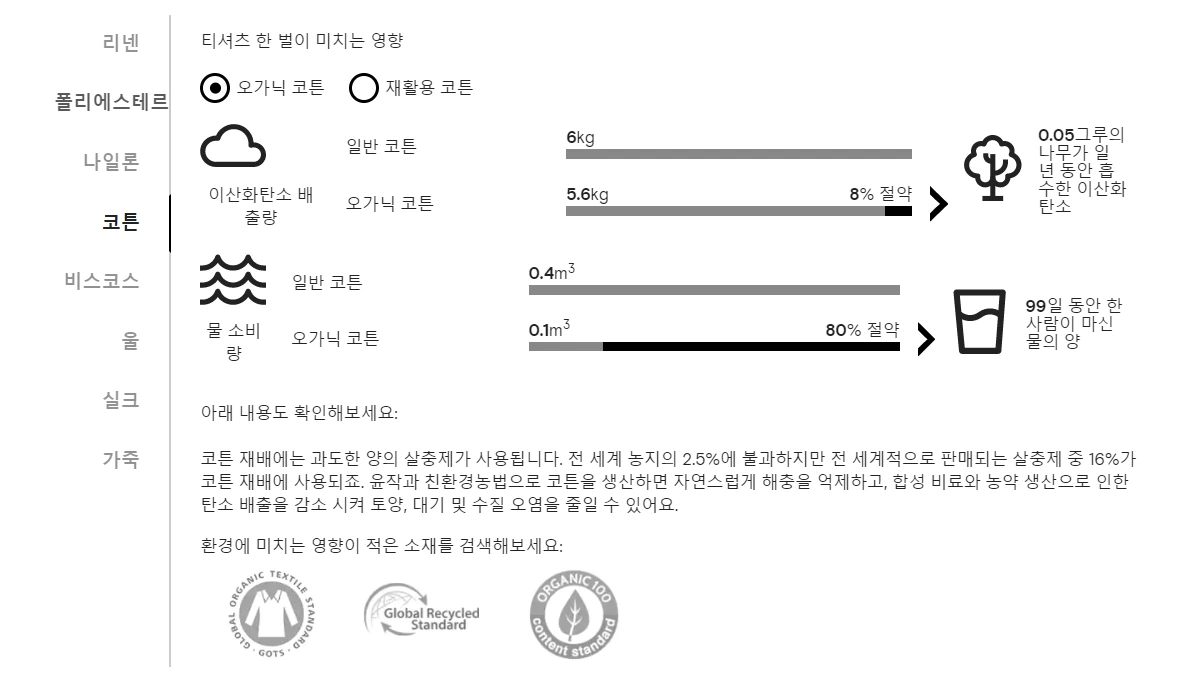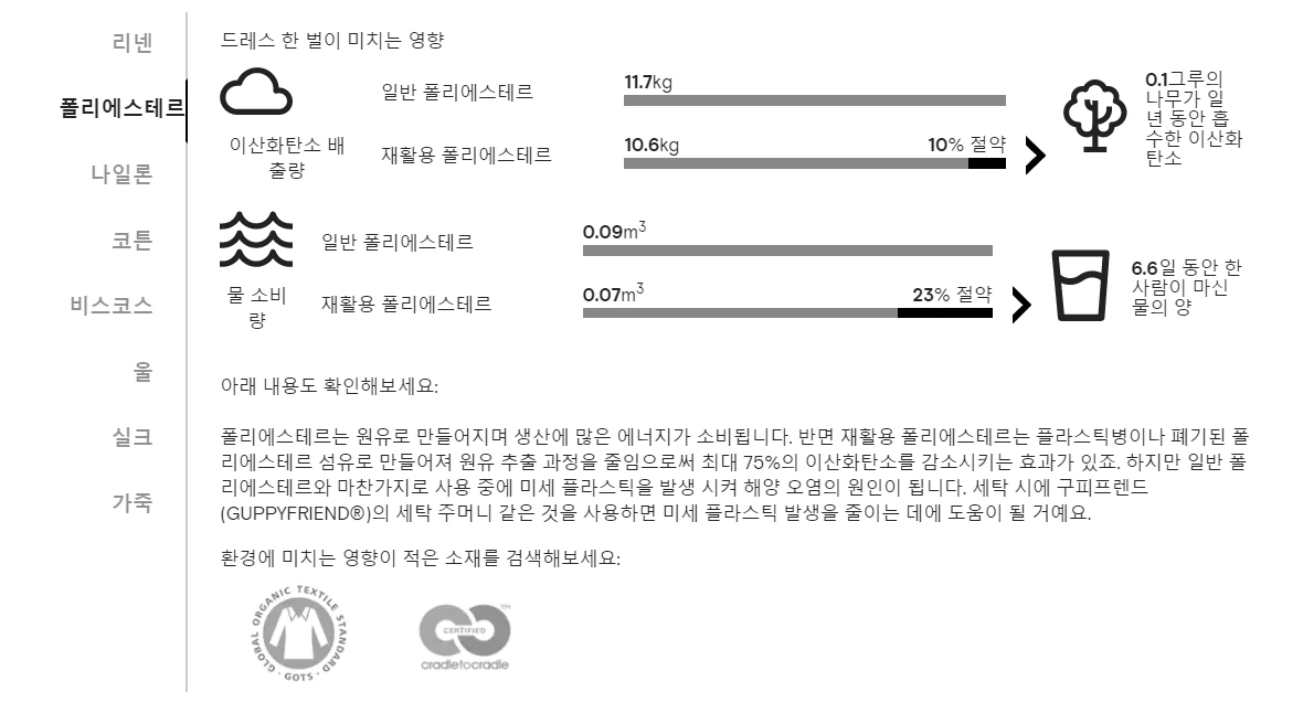 먼저, 아래 사이트에서는 소재별로 이산화탄소 배출량과 물 소비량을 알려줍니다. 그리고 각 소재별로 대체할 수 있는 지속가능한 선택지도 소개하고 있습니다.