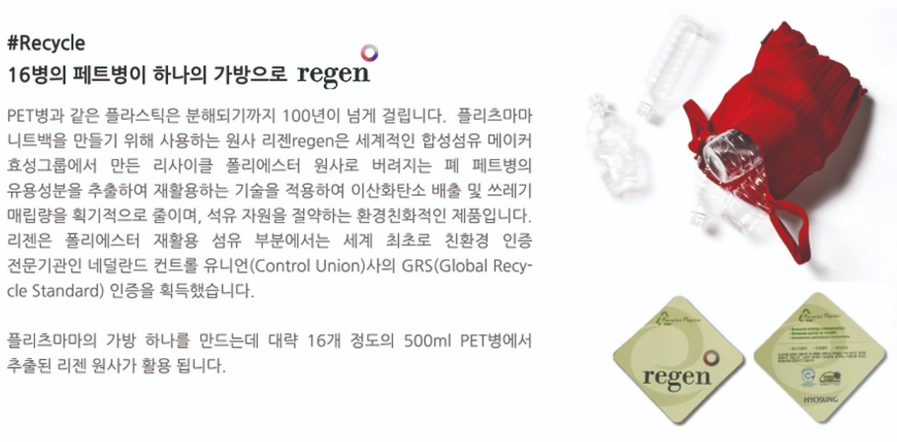 지난 글에서 소개드렸던 플리츠마마입니다. 버려진 플라스틱에서 원사를 뽑아내 니트플리츠 가방을 만드는 업사이클링 브랜드입니다. 포장까지 최소한으로 줄이는 등 여러 부분에서 환경을 위하시더라구요!