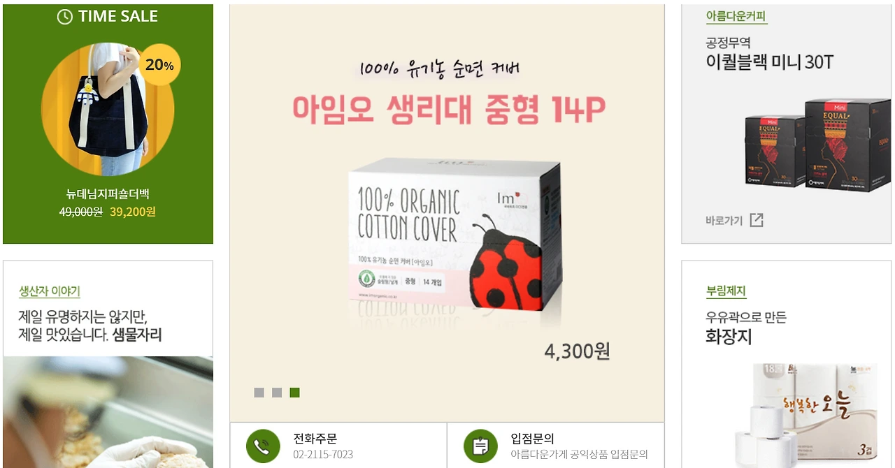 마지막으로 지금까지 언급했던 친환경소재, 공정무역, 업사이클링을 아우를 수 있는 끝판왕 소개합니다^_^ 아름다운 가게에서 운영하는 뷰티풀마켓인데요! 뷰티풀마켓은 '공익상품'을 판매하는 쇼핑몰입니다. 공익상품은 사회적 기업, 친환경 단체, 공정무역 단체나 장애인재활단체에서 제작한 상품들을 포함합니다. 공익상품의 판매를 통해 더 많은 사회적 기업과 단체들이 활동하고 더 많은 취약계층이 자립할 수 있기를 기대합니다. 오늘은 쿠팡 말고 뷰티풀 마켓 들어가봅시다. 유기농 생리대, 우유곽으로 만든 화장지, 공정무역 커피 등 엄청 다양한 게 많네요. 오, 감자라면까지... 엄마아빠한테도 알려줘야겠어요!! 뷰티풀마켓뿐만 아니라 여기저기 많이 위치해 있는 아름다운 가게에도 한번쯤 들러주세요!