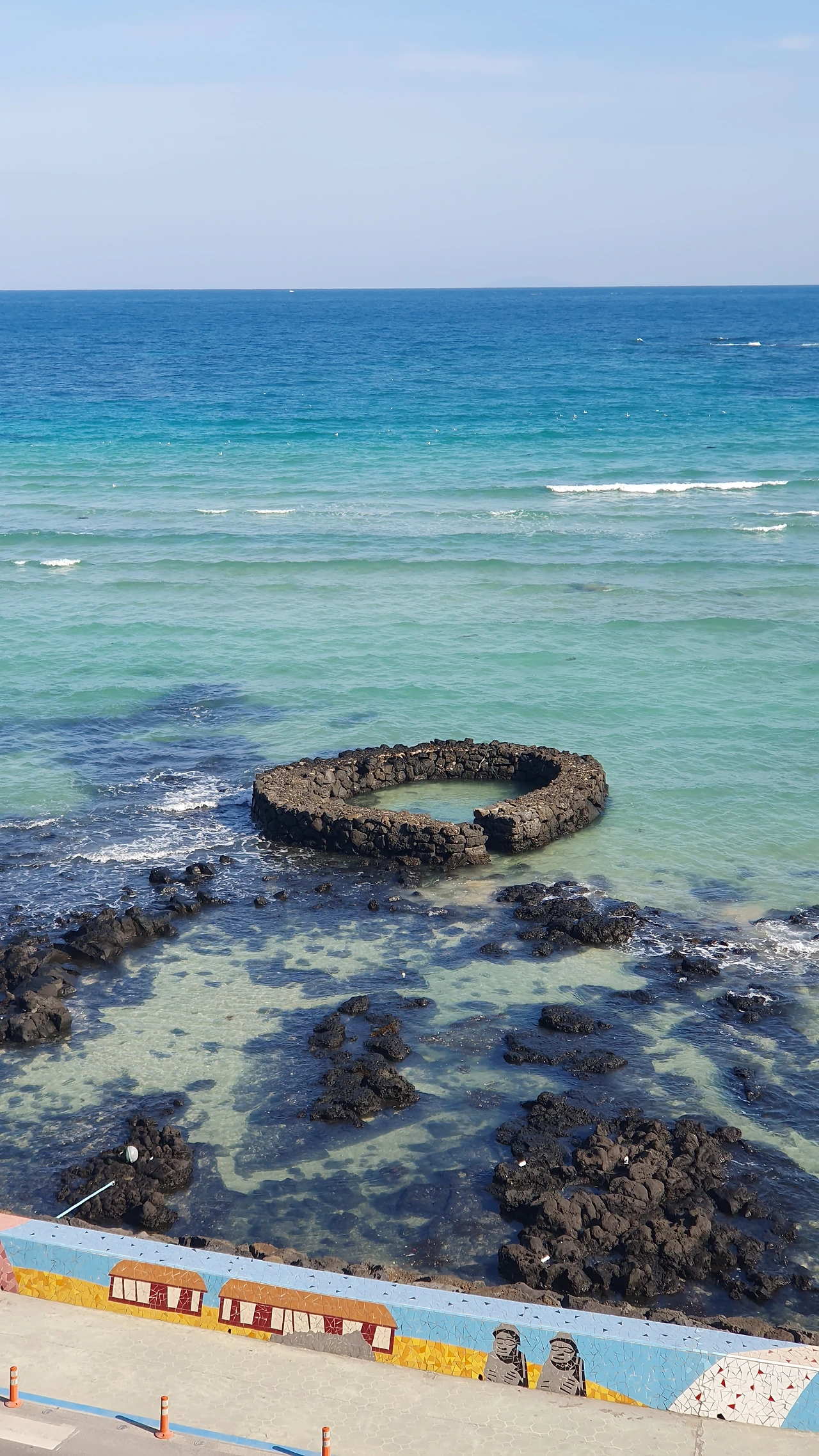 에코랜드를 구석구석 누비느라 한참을 걸었다. 원래는 근처의 돌문화공원까지 가는 것이 목표였으나, 도저히 어려울 것 같아 함덕으로 이동하기로 했다. 대흘리에 위치한 에코랜드에서 곶자왈을 누비고 나와 함덕해안으로 향했다. 702-1번 버스를 타고. 예상한 버스의 모습과는 다른 자그마한 마을 버스 같은 차가 다가와서 의외였다. 기사님의 운전은 거칠었지만, 풍경을 감상하기엔 충분한 속도였다. 버스로 이동하는 순간이 좋았다. 뚜벅이가 누릴 수 있는 드라이브. 특히 마을 곳곳을 누비는 것이 좋다. 내가 기대한 제주 여행은 제주만의 특별한 정경으로 두 눈을 가득 채우는 것이었는데, 이건 도심이 아니라 시골 마을을 구석구석 살펴보아야 담을 수 있는 풍경이다. 제주 특유의 독특한 가로수와 돌담들이 자아내는 분위기가 정겨웠다. 제주의 매력은 시골 마을에 있다.