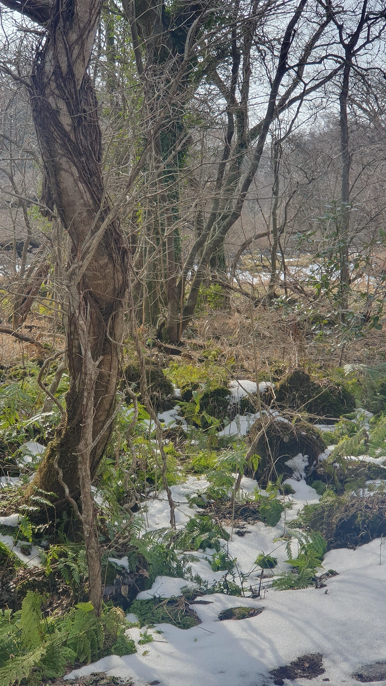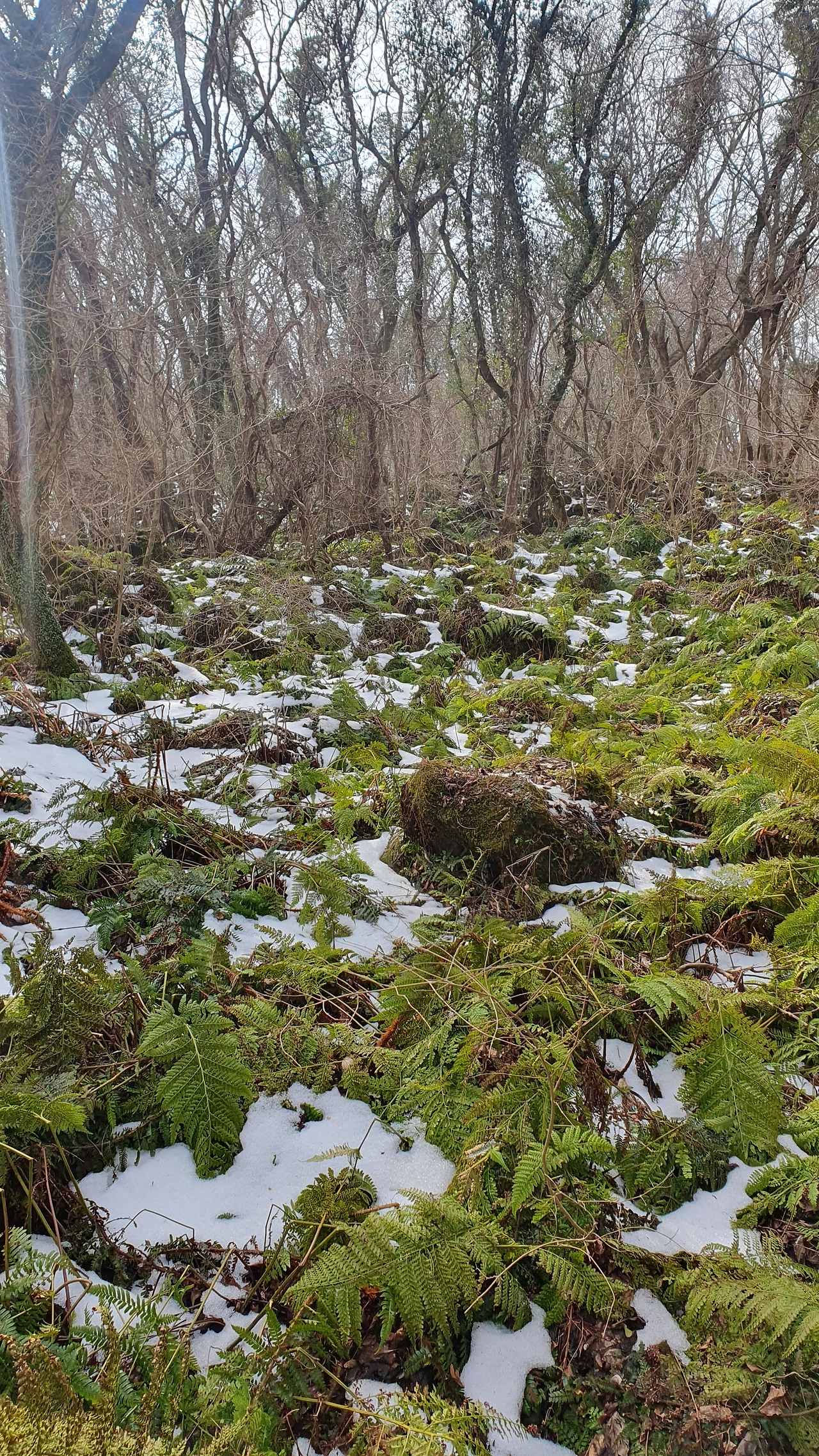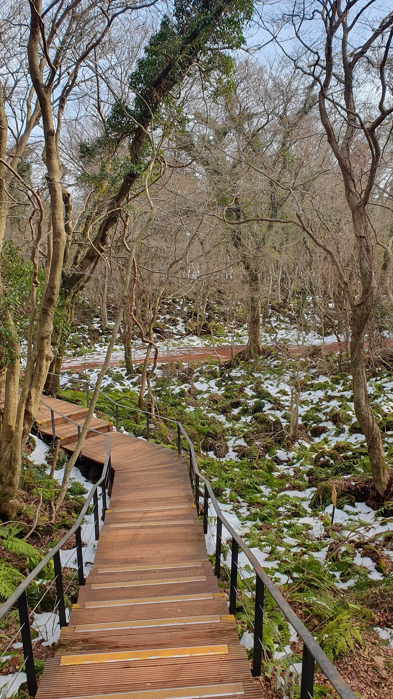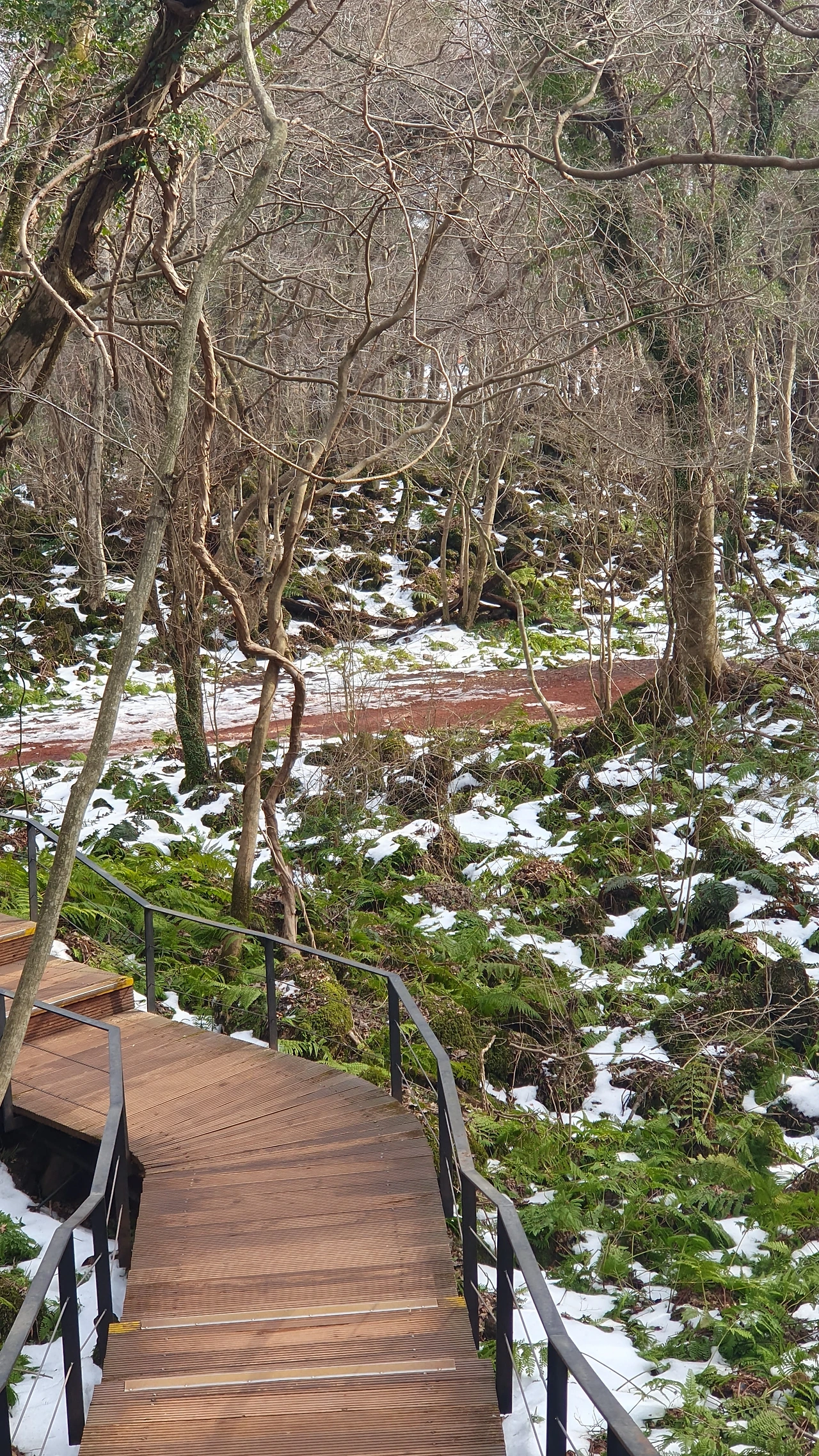 에코랜드에서 내 시선을 자꾸만 뺏었던 것은 숲의 풍경이었다. 꼬불꼬불 자란 나무와, 그 아래 둥글둥글 늘어선 현무암들, 그 위를 덮은 초록빛 고사리와 이끼, 그리고 그 위에 쌓인 하얀 눈. 색의 조화가 아름다웠고, 이국적인 풍경이었지만, 특히 제주다웠다. 각진 화강암이나 잘 다져진 흙으로 가득한 육지와 달리, 동그란 현무암과 이끼는 너무나 독특했다. 이런 숲을 ‘곶자왈’이라고 부른댔다. 곳곳에 눈이 녹아 신발을 지키기 위해 필사적으로 덜 녹은 곳만 디디느라 고개만 처박고 걷기도 했지만, 눈 덕분에 곶자왈의 풍경이 더 조용하고 폭신했다. <원령공주>에 나왔던 신비한 숲이 겹쳐 떠올랐다. 에코랜드는 이곳저곳 재미 있는 테마로 꾸며놓았지만, 겨울 한복판이라 라벤더도 없고 동백도 없었다. 하지만 아쉽진 않았다. 곶자왈로 눈의 즐거움이 충분한 공간이었다. 조용한 곶자왈의 숲을 발소리로 채우며 걷는 순간이 감사했다.