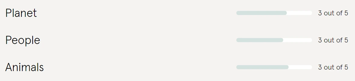 동물: 5점 만점에 3점을 받았습니다. 모피나 앙고라털, 혹은 특수동물의 가죽이나 털을 사용하지 않고, 뮬레싱(털의 질을 높이기 위해 양의 피부와 살점을 도려내는 것)하지 않은 양모를 사용한다고 밝혔지만, 출처를 명시하지 않은 채 가죽이나 오리털, 거위털 등을 사용한다는 점에서 점수가 깎였습니다.