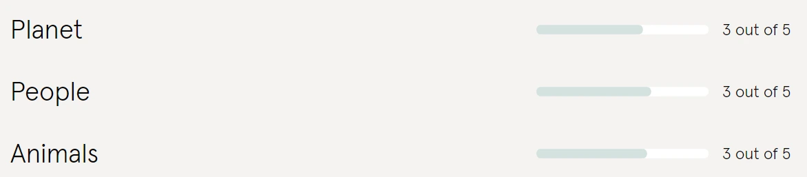 동물: 3점. 뮬레싱(털의 질을 위해 양의 꼬리살을 도려내는 것)을 하지 않은 양의 털을 사용한다고 명시했고, 앙고라나 특수동물의 털/가죽을 사용하지 않지만 가죽과 다운(깃털)을 사용하고 있습니다.