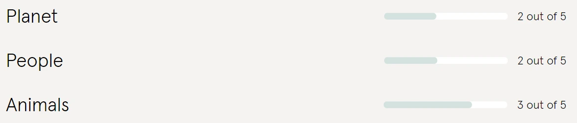 노동: 2점. 노동자 권리를 위한 계획이 부재합니다. 공급라인 중 완제품 단계의 모든 제품들은 감사받지만 제조공장에 대한 공개된 목록이 없습니다. 최저임금을 보장한다는 언급이 없고, 완제품 단계에서 노동착취의 가능성도 높이 제기되고 있습니다.