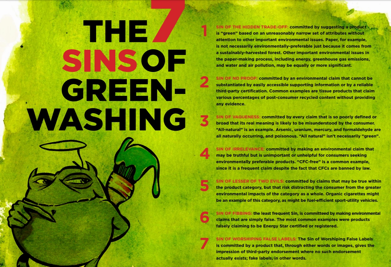 1. Sin of the Hidden tradeoff(숨겨진 이율배반): '친환경'이라고 해도 생산과정에서 환경파괴적일 수밖에 없는 것. 종이는 아무리 친환경적인 과정으로 생산하려 해도 재료생산을 위한 벌목과 각종 처리과정에서 사용하는 물, 에너지, 그 과정에서 발생하는 수질/대기오염과 온실가스 배출 등으로 환경파괴적인 과정이 수반하는 제품이다. 재생종이라고 해도 종이를 표백하기 위해서는 환경을 파괴할 수밖에 없음.