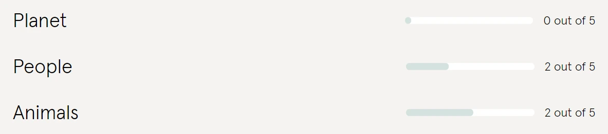 환경정책과 관련된 정보를 공유하지 않음. (굿온유에서는 관련정보를 충분히 공유하지 않으면 그만큼 낮은 점수를 부여합니다. 소비자는 제품의 생산과정이 미치는 환경적 영향을 알 권리가 있고, 브랜드는 운영방식을 투명하게 공개해야 할 필요가 있습니다.)