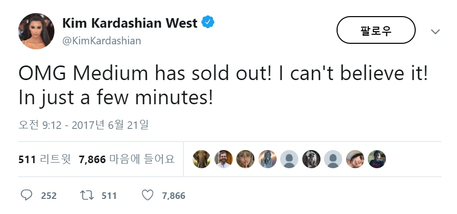 킴 카다시안의 아이셰도우 키트 Medium 라인이 오픈 15분만에 팔렸고, 2시간 반에 전 제품 매진
