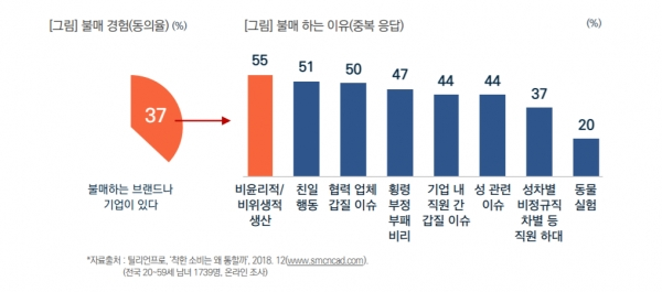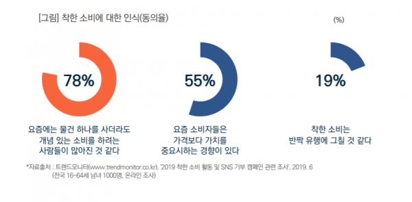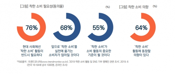 목회데이터연구소에서 2020년 1월 31일 발표한 대한민국 트렌드 리포트에서는 착한 소비에 대한 사람들의 관심을 여실히 보여준다. 과반수의 사람들이 착한 소비에 대한 필요성에 동의했고, 앞으로 더 많은 사람들이 착한 소비에 동참할 것이며, 착한 소비가 잠깐의 유행에 그치지 않을 것이라고 답했다. 또 3분의 1 이상의 사람들이 비윤리적인 이슈가 나타난 브랜드를 불매하며, 적극적으로 자신이 추구하는 가치를 반영한 소비를 하고 있다.