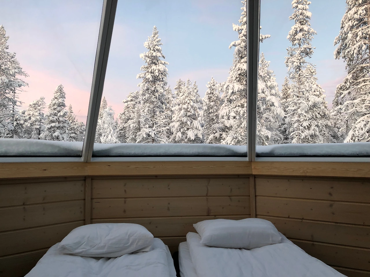 긴 눈길을 지나 눈밭 한가운데의 작은 오로라 캐빈 마을이 보였다. 모닥불 앞에 놓인 따스한 안락의자에서 금방이라도 잠이 들 것 같은 피로를 꾹꾹 눌러 참으며 체크인을 하고, 폭폭 빠지는 눈길을 걸어 우리에게 배정된 오로라 캐빈에 들어섰다. 마을에 띄엄띄엄 늘어서 있는 단독 오로라 캐빈은 며칠 동안은 오롯이 우리만의 것이었다. 밤은 이미 한참이 깊었다. 오로라 캐빈의 유리 천장에는 소복이 눈이 쌓여 있었다. 직원이 전기를 작동해 천장의 눈을 녹이자 서서히 밤하늘이 우리 머리 위로 드러났다. 북유럽의 침엽수들 위로 또 사락사락 눈이 쌓이고 있었다. 밤새 내릴 싸락눈이 이 눈의 마을을 더 조용히 덮어 줄 것이다. 포근한 이불 같은 싸락눈 소리가 먼 길을 돌고 돌아온 길었던 하루의 지친 마음을 조용히 덮어 주었다.