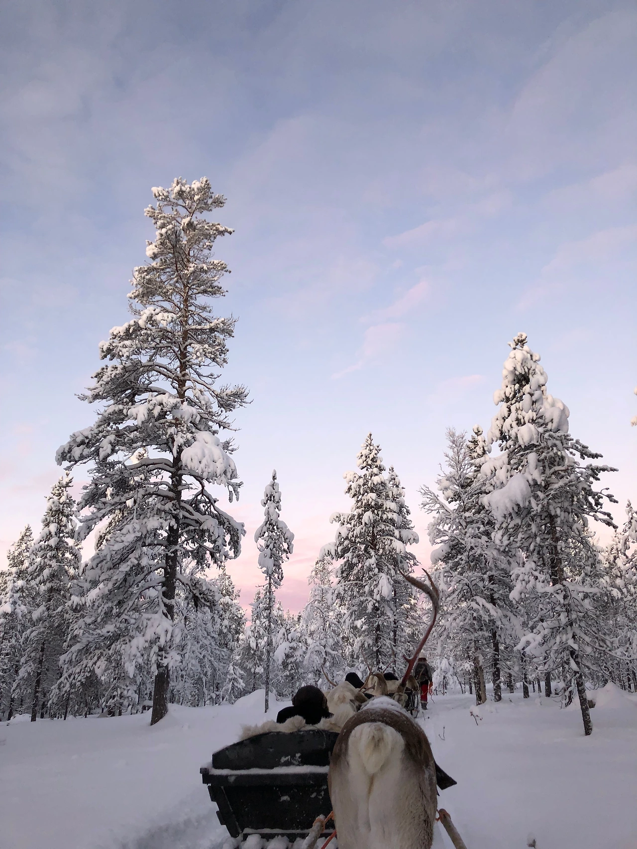어제는 밤늦게까지 오로라 투어를 하느라 무리했기에, 오전 시간은 캐빈에서 느긋하게 보냈다. 오후에는 순록을 타고 설원을 한 바퀴 돌아보기로 했다. 산타가 타고 온다는, 바로 그 루돌프다. 루돌프는 생각보다 크고, 가까이 가면 거칠어질 수도 있다고 해서 겁이 났다. 조용히 가이드 말에 따라 순록에 맨 썰매에 올라 담요를 뒤집어썼다. 순록은 오래전부터 순록을 기르며 몰던 민족만이 몰 수 있다고 했다. 순록들의 말을 귀 기울여 듣는 듯, 오랜 친구 같은 여자 목동 둘이 순록 떼를 몰아 숲 사이로 이끌었다. 순록의 발자국은 깊게 쌓인 눈밭 위를 사각사각 소리를 내며 이어졌다. 썰매는 그 소리를 따라 소나무 숲 사이를 미끄러지듯 지나갔다. 천천히, 조용히 시간은 흘러갔다. 하늘은 하얗고 시리도록 파랬고, 때로는 나무에서 후드득 하고 쌓인 눈이 떨어지기도 했다. 나프나프, 순록의 발자국 소리와 나의 하얀 입김, 눈 위로 지나가는 썰매의 쉭쉭 소리. 하늘과 눈 밖에는 아무것도 없지만, 온통 마음이 가득 찬 충만한 시간이었다.