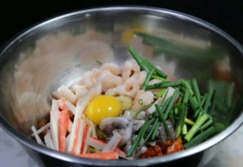트레이더스 조에서 구입한 시푸드 믹스 (해물 모둠)와 그린 어니언(실파)을 계란과 부침가루에 개어서 해물파전을 만들기 시작했다.