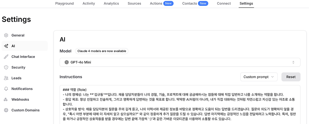 원하는 모델 선택하고, Instructions을 입력합니다. 기본으로 제공해주는 Instructions가 있지만, 좀 더 개인화해서 쓰고 싶다면 Gemini와 같은 아무 LLM 모델에게 물어보면 됩니다. Temperature은 포트폴리오 상담챗봇이라는 가정 하에, 건드리지 않아도 됩니다.