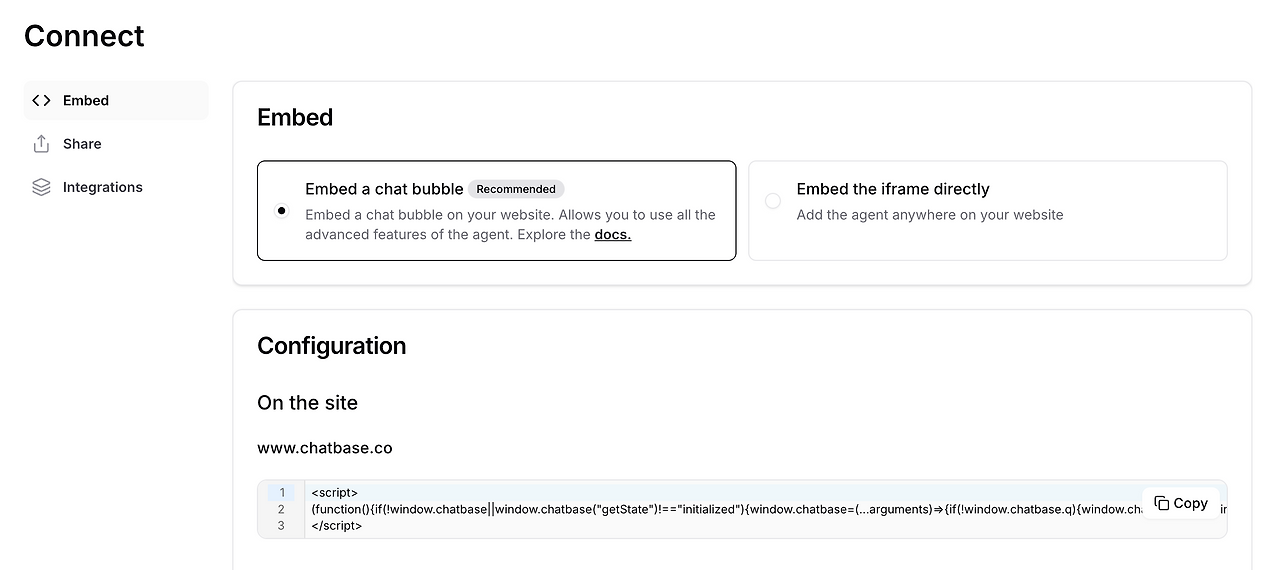 6. 상단 "Connect" 메뉴, Embed 탭에서 "Embed a chat bubble"을 선택하고, Configuration의 "www.chatbase.co" 아래에 있는 코드를 Copy해주세요.