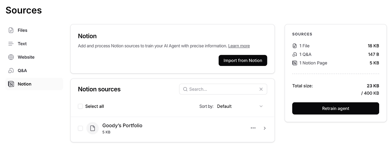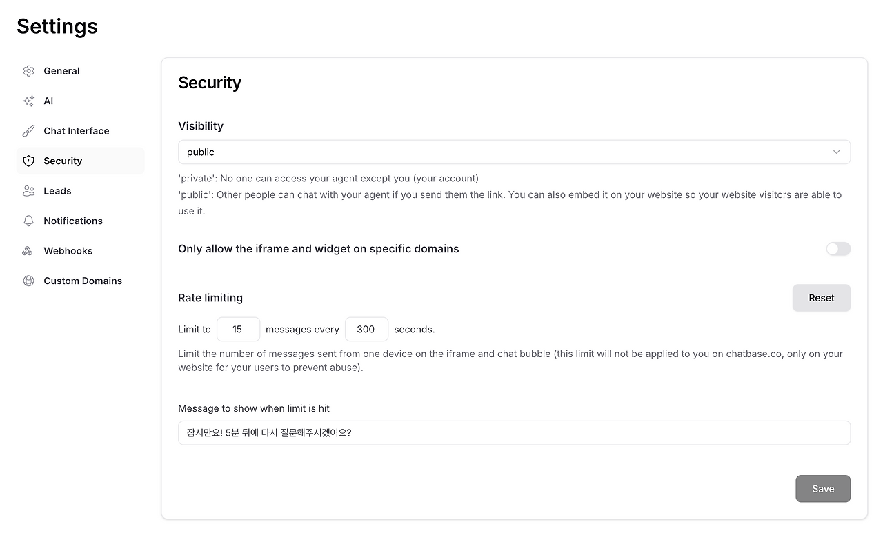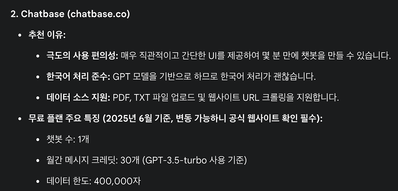 Chatbase는 개인으로도 약 2~30분이면 그럴싸한 AI 챗봇 하나를 무료로 만들 수 있고, 나름 최신 LLM 모델로 학습도 가능하며, 무엇보다 노션 웹사이트 지원과 한글 지원도 됩니다. 물론 용량은 작지만, 월 몇만 명이 들어오는 유명한 웹페이지가 아니기 때문에 적은 메시지 한도로도 충분하다고 판단했습니다.