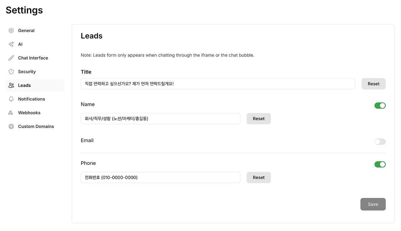 누군가 챗봇을 눌러 첫 번째 질의응답이 끝나면, 그들에게 "연락처"를 요구할 수 있습니다. 사진처럼 정의하실 수 있어요.