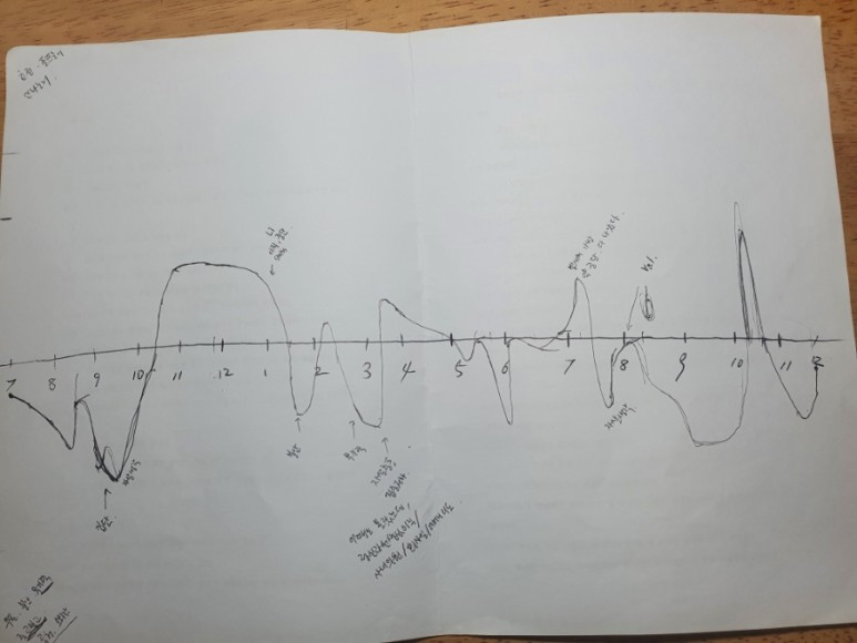 주치의가 생각해보라는 것들에 대해 끄적이고 난 뒤에는 교수님과의 면담이 있었다. 주치의는 바쁜지 교수님 혼자였다. 교수님은 아까 주치의랑 그래프 그린 거 어땠냐고.. 나는 당황스러웠다 말했고, 교수도 덩달아 당황스러웠다말했다. 왜인가 했더니.. 분명 여기 대학병원와서 진료받고 나아진 부분이 있는데 내가 모르겠다고 해서.. 라고 하셨다. 흠.. 뭔가 기분이 나쁘셨나? 라는 생각이 잠시 들었고, 교수는 그 일치되지 않는 간극을 한번 맞춰보자고 했다.