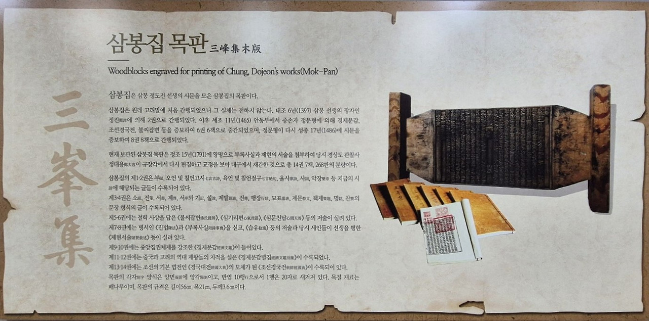 1791년 정조는 삼봉의 학문과 정치적 업적을 높이 평가하여 삼봉집을 보완하여 편찬하라는 명을 규장각에 내렸고, 누락된 글을 보완해 14권 7책으로 증편∙간행하여 목판으로 서각하였다. 이것이 <삼봉집(三峰集)>으로, 이의 영구 보존을 위해 네 곳의 사고에 보관하였고, 정족산사고와 태백산사고에 보관했던 완벽한 삼봉집은 현재 서울대학교 규장각에 소장되어 있다. 후손인 봉화정씨문헌공파대종회의 소장본이 삼봉기념관에 소장되어 있다.