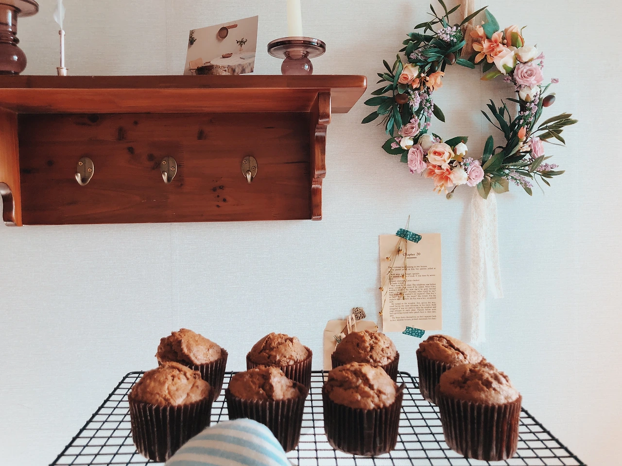 갓 구운 머핀을 꺼내 식힘망 위에서 한 김 식힌 후에 바로 먹으면, 윗면은 바삭하고 안은 폭신해서 두 가지 식감을 같이 즐길 수 있다.