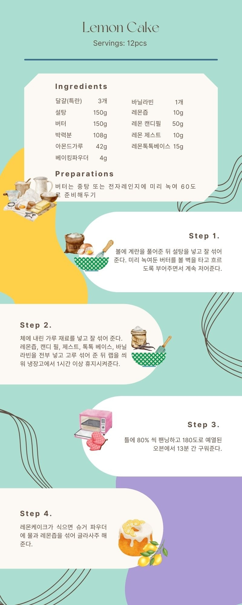 그런 날에는 레몬케이크를 만든다. 마들렌 계열의 반죽에 레몬즙, 레몬 제스트, 레몬 캔디필 같은 재료를 잔뜩 넣어 맛과 향을 한껏 끌어올려준다.