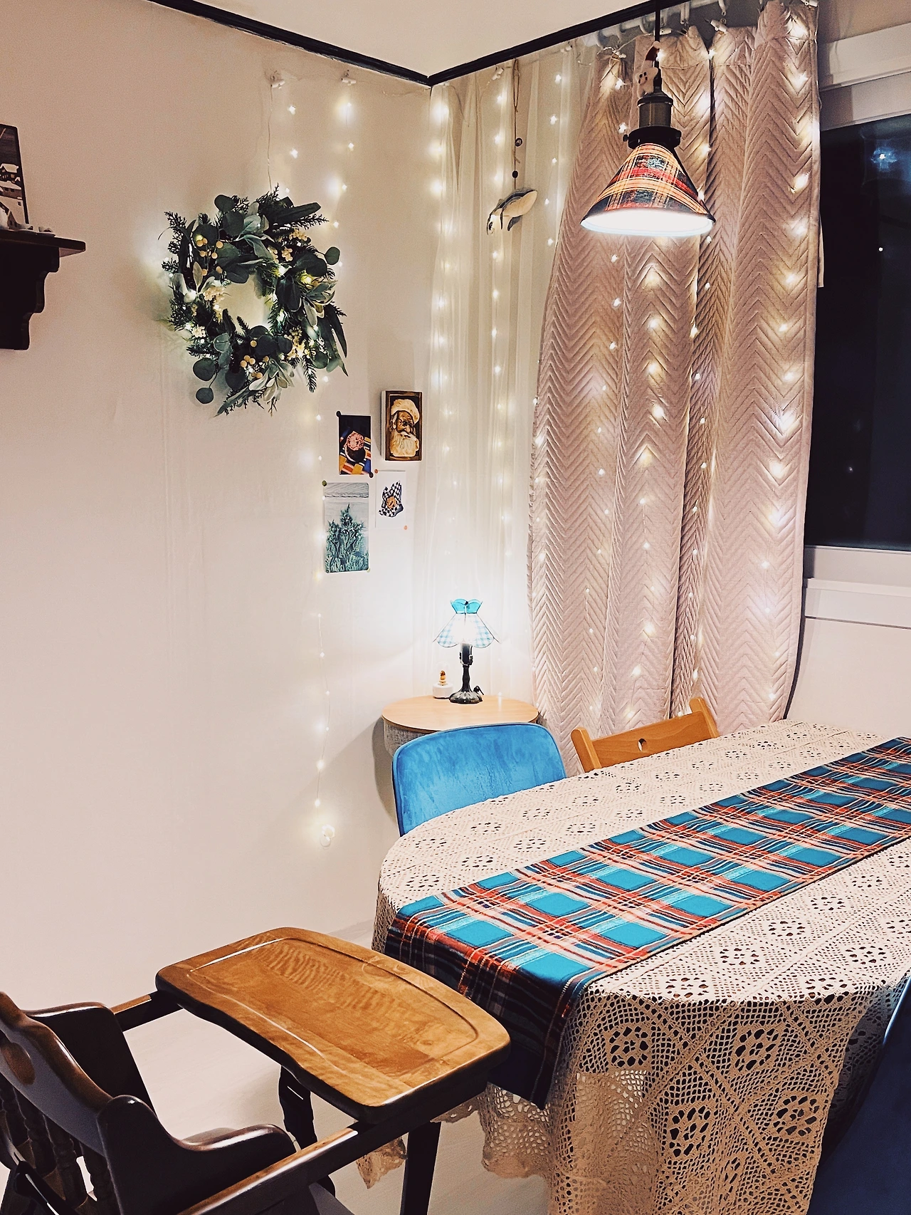 평소에는 식탁보를 따로 깔지는 않지만, 좀 더 따뜻한 분위기를 위해 손뜨개 식탁보를 덮어준다. 이것도 원래의 용도는 커튼이었으나, 뭐든 응용하는 것은 좋은 아이디어다.