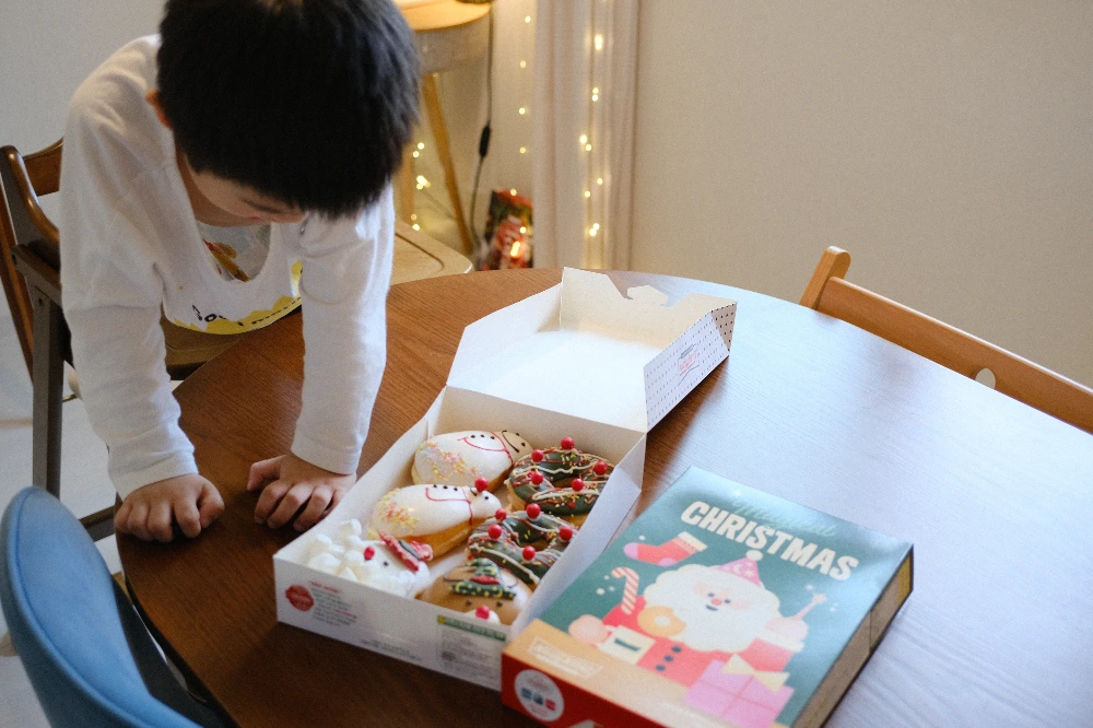 작은 사람은 쪼르르 달려와 식탁 위에 자리를 잡고 앉았다. 올해 봄, 미니 LED 전구를 미처 치우지 않은 덕에 크리스마스 준비는 매우 수월했다. 직접 그린 민트색 바탕의 마트리카리아 캔버스를 치우고 그 자리에 리스를 걸었다. 작년에 리스가 자리했던 곳에는 커다란 액자가 있어 그 옆으로 솔잎 가랜드를 걸어줬다. 크리스마스 시즌에만 등장하는 산타 클로스 아이싱쿠키 액자와 작년에 작은 사람이 만들어준 크리스마스 카드도 꺼냈다. 언젠가 구매한 겉옷에 딸려왔던 케이프는 잘 다려 나무 선반 위 덮개로 올려뒀다. 반짝, 불을 켜두고 캐럴을 들으며 작은 사람과 함께 기념으로 크리스마스 도넛을 먹었다.