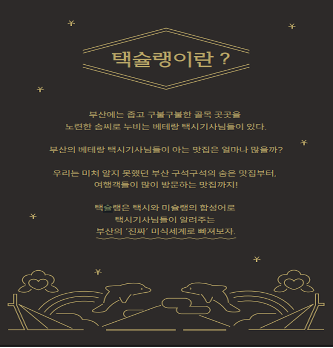 택슐랭은 미슐랭 + 택시의 합성어입니다. 말 그대로 오랜 시간 부산의 구석구석을 누빈 베테랑 택시기사님들이 직접 선정한 맛집을 소개하는 콘텐츠예요. 부산의 맛에 한해서는 그 누구보다 잘 아는 비공식 맛집 전문가들이 알려주는 부산의 미식세계는 어떨지 궁금하게 합니다.
