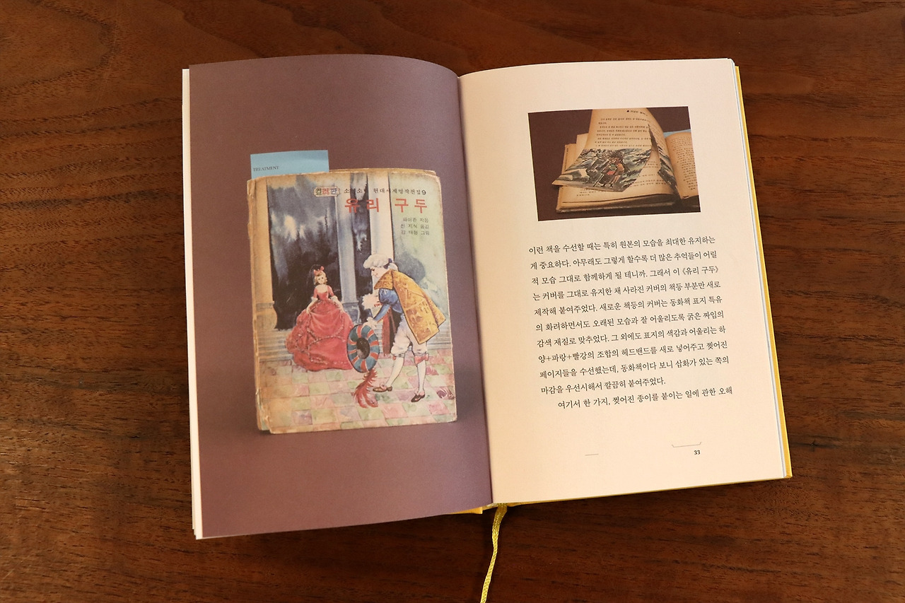 몇 년 전 이 책의 보존 방법에 대해 심각하게 고민할 무렵 눈에 들어온 것이 바로 ‘책수선’이라는 단어였다. 정확히는 ‘재영 책수선’이다. SNS를 통해 책수선에 대한 소소한 이야기를 들을 때마다 왠지 내 이야기를 듣는 듯했다. 아. 세상에는 오래된 책을 어쩌지 못하고 어떻게든 간직하고 싶어 하는 사람들이 나 말고도 이렇게 많구나 하는 생각도 들었다. 또 책을 수선하면서 새로운 이야기를 만들어 내는 이 분은 대체 어떤 분일까 라는 궁금증도 생겼다. 그러면서 훗날 언젠가 오래되어 낡아버린 책과 그 책의 수선을 맡긴 주인의 사연들, 그리고 책을 수선하는 이의 이야기들을 모아 또 한 권의 책을 만든다면 좋겠다는 생각도 했다.