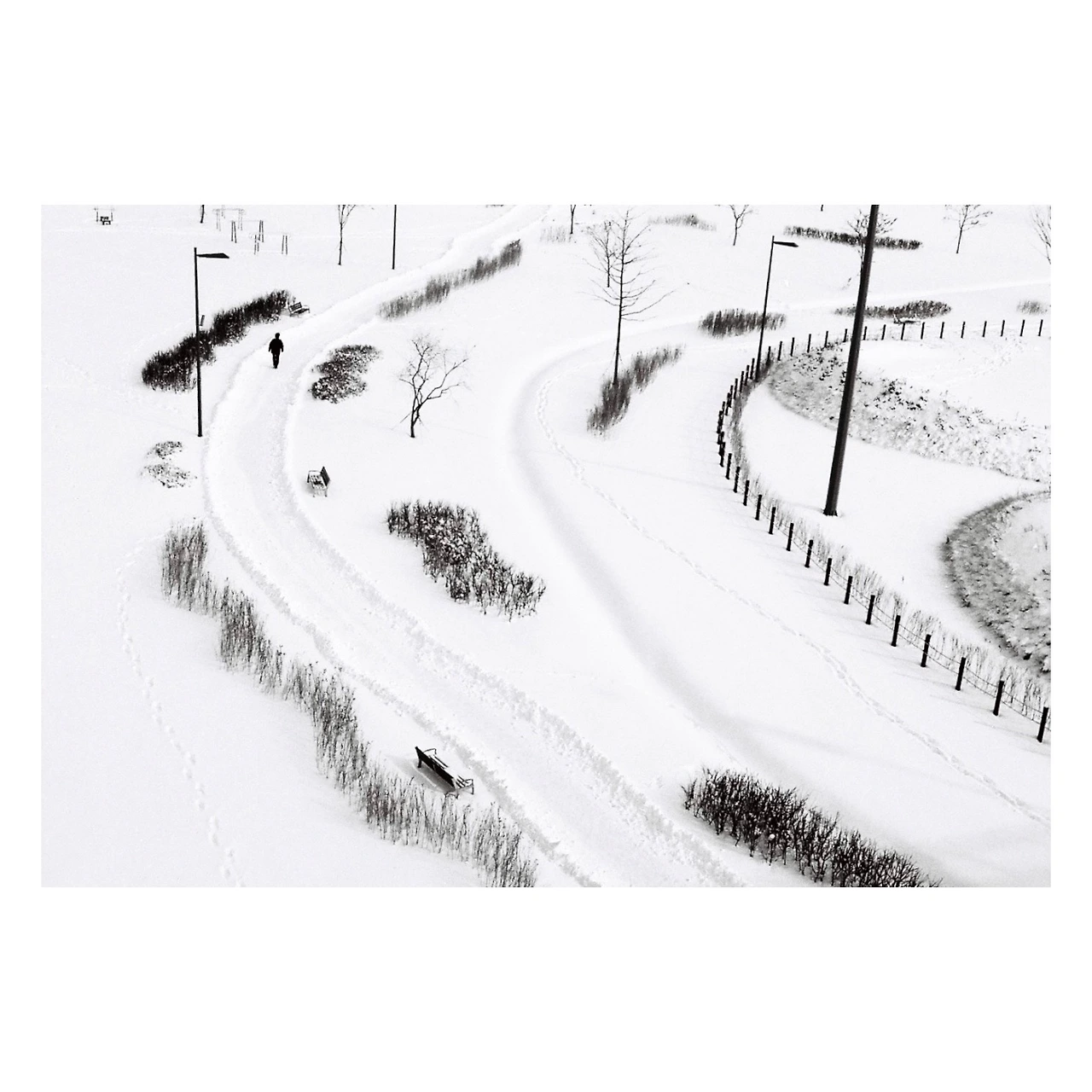 말 없는 공간, 아직 채워지지 않은 시간. 그 사이에서 벤치는 앉히기보다 기다리고, 가로등은 밝히기보다 그저 허술하게 서 있을 뿐. 움직임이 최소가 되는 대신 흰 여백은 최대가 된다.