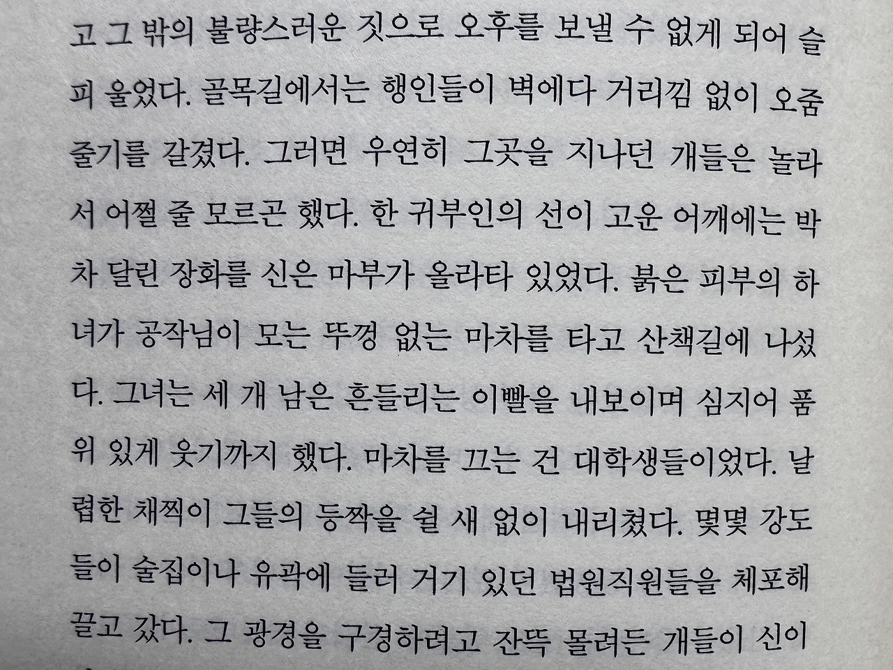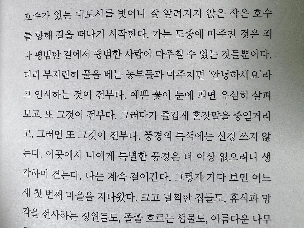 '더러 부지런히 풀을 베는 농부들과 마주치면 안녕하세요"라고 인사하는 것이 전부다' (임홍배 역)