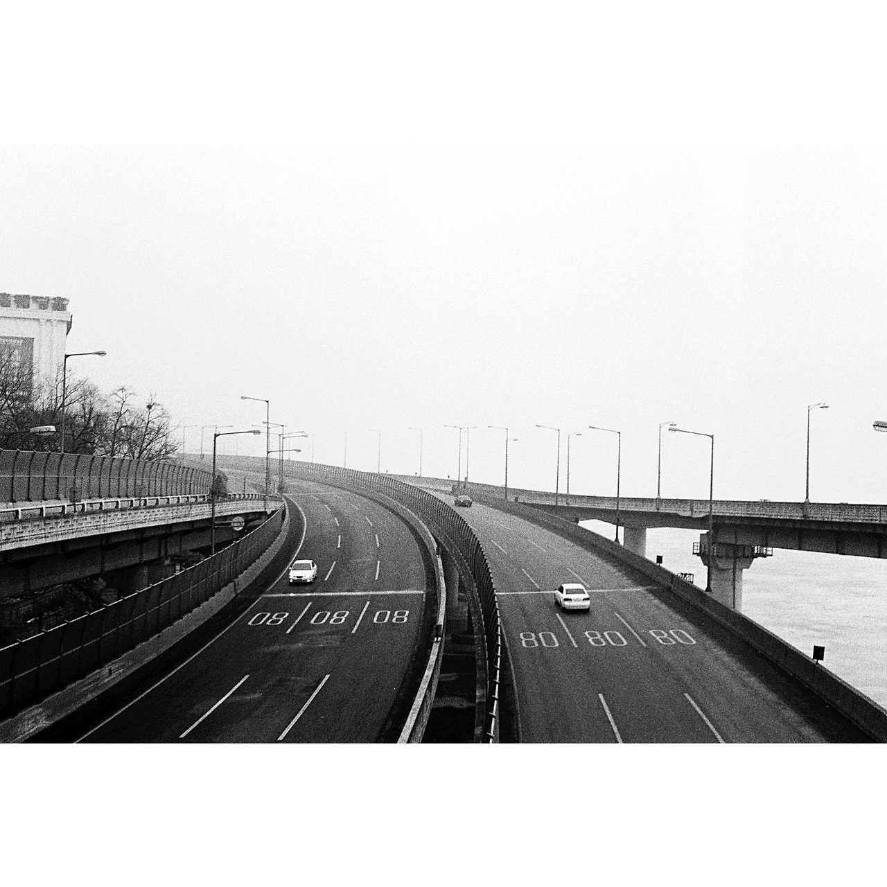 빗방울이 툭툭 떨어지던 어느 해 겨울. 내가 서있던 다리와는 또 다른 층위에 있던 다리 위에서 두 대의 자동차가 속도 표시선 위로 엇갈려 지나가는 순간을 보았다. 아무런 사전 인식도 없이 셔터를 눌렀고, 이 사진은 나중에 내가 아끼는 사진 중에 하나가 되었다.