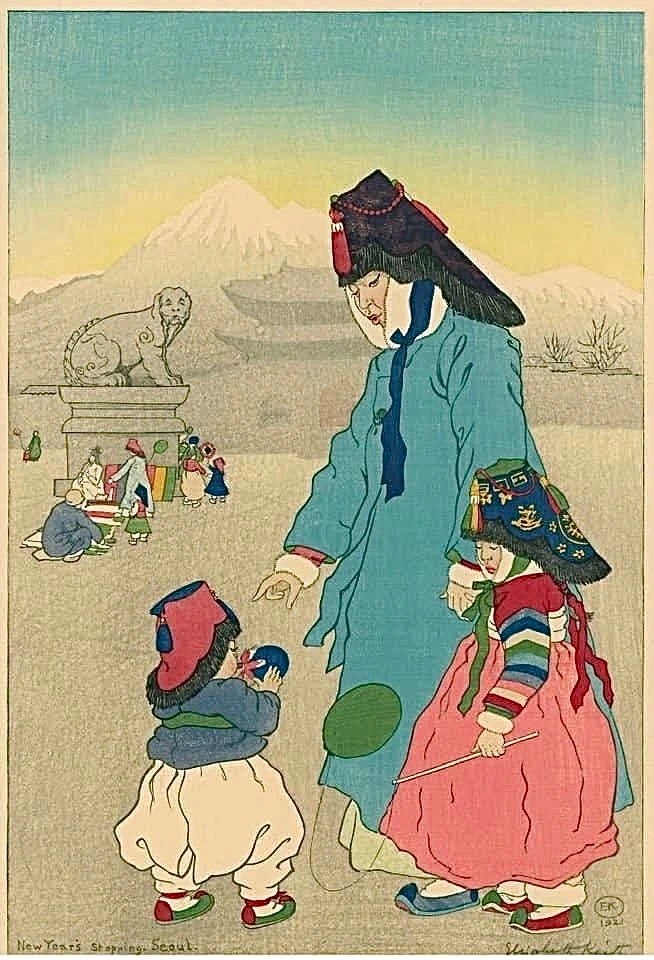 〈정월 초하루 나들이〉는 키스가 1921년에 그린, 설날광화문 앞 풍경을 담아 목판화로 제작한 작품입니다. 키스는 자신의 저서 〈동양의 창〉에서 이 작품을 두고 “정월 초하루인 설은 한국 최대의 명절이다. 이 날은 남녀노소를 막론하고 누구나 제일 좋은 옷으로 갈아입고 나들이를 한다”라고 적었습니다.