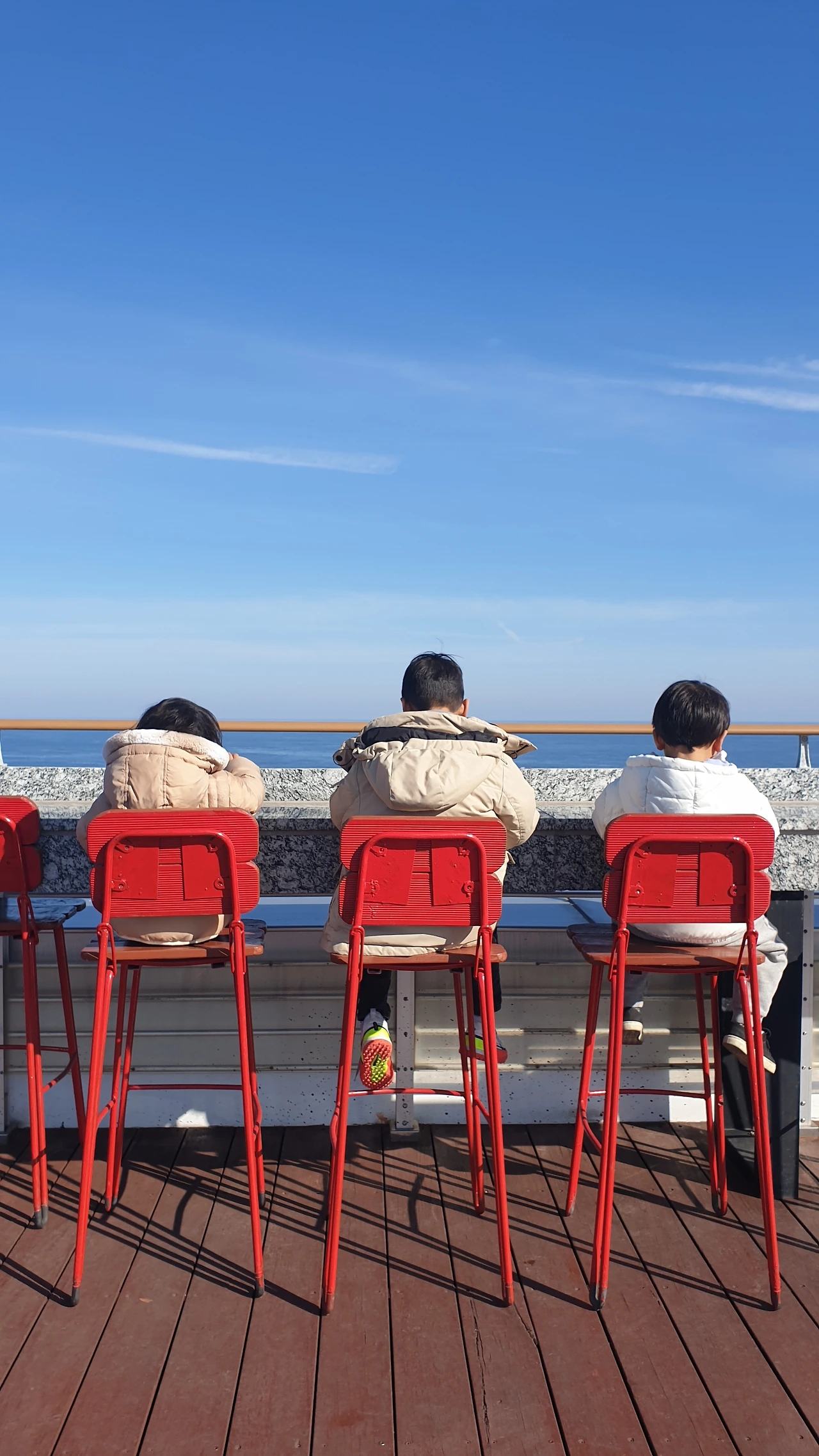 용화역 5층 전망대에서 새파란 하늘이 곧 봄이 옴을 예고하며 나를 맞이해주고 있었다. 그 하늘에 바로 맞닿아있는 에메랄드빛 바다는 그 곳에 한참을 머물고싶다는 생각을 안겨주었지만 나는 그럴 수 없었다. 세 아이들이 저마다 흩어져 전망대를 놀이터 삼았기 때문이다. 첫째는 구석에 쌓여서 얼어버린 눈더미 위에서, 둘째와 셋째는 여기저기 돌아다니며 탐색을 시전하고 있었기에 눈을 어디에 둬야할지도 모르겠고 마음이 불안해져만 갔기 때문이다. 내 눈은 하늘과 바다에 고정시키고 싶었는데...이 곳에서 아무 방해 받지 않고 책 읽으면 정말 환상적이겠다..는 꿈만 잔뜩 품은 채로 아이들을 데리고 다시 3층 탑승장으로 내려갔다.