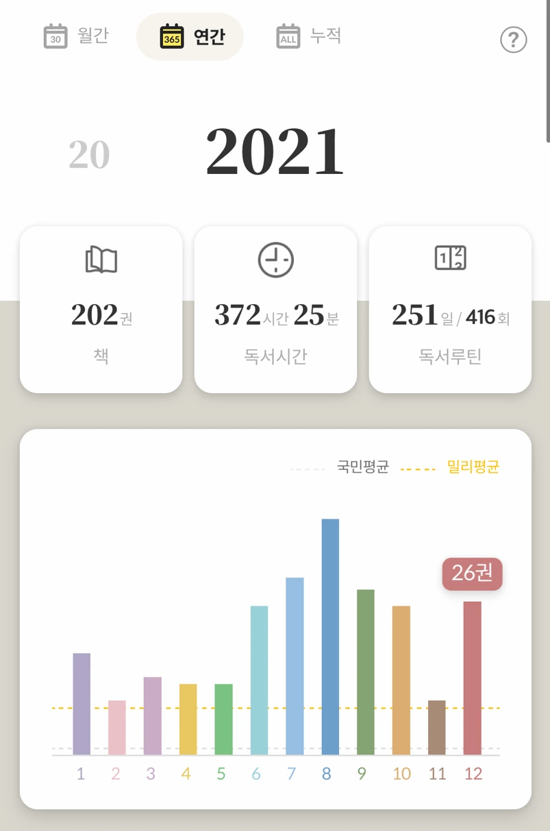 올 한 해 밀리의 서재에서 총 372시간 책을 읽었다. 평균 내어 보니 하루에 1시간꼴로 읽은 셈이다. 핸드폰으로 매일 SNS를 들어가 보듯이 [밀리의 서재]를 매일같이 들어가곤 했다. 한 권을 완독 하겠다는 욕심은 내려놓고 매일 조금이라도 꾸준히 읽으며 나의 세계를 넓혀가려고 했다. 그렇게 독서는 올해 나의 베스트 프랜드이자 최고의 취미생활이 되었다. 2021년의 마지막 날을 기념하여 매일 이렇게 꾸준히 책을 읽으면서 내가 무엇을 얻었는지, 내게 생긴 변화가 무엇인지 정리해보았다. 책을 많이 읽으면 도대체 뭐가 좋을까?