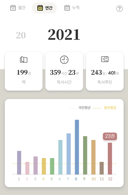 올 한 해 총 359시간 독서를 하였다. 밀리의 서재를 통해 핸드폰으로 책을 읽기 시작하면서 매일매일 시간이 나면 책을 읽기 위해 핸드폰을 들었다. 워커홀릭일 때도 최대한 주말이면 서점에서 책을 한 권씩은 읽곤 했지만 매일같이 책을 보진 않았다. 퇴근하고 돌아오면 책에 집중할 만큼의 에너지도 남아있지 않을 때가 있었으니까. 그런데 워라밸이 생기니 나는 이전보다 남는 시간이 생겼고 이 시간에 큰 부담 없이 할 수 있는 취미활동이 필요했다. 누구나 부담없이 손쉽게 시작할 수 있는 취미생활은 독서였다. 뭘 해야 할지 모를 때, 뭘 하고 싶은지도 모를 때, 독서를 하면서 나를 알아갔고 세상을 알아갔다. 그렇게 올해 책을 꾸준히 읽으면서 내가 깨달은 건, 시간이 없어서 책을 읽지 못한다는 건 핑계가 아니라는 거다. (내 기준에서는) 워라밸이 좋아지고 시간이 많아지니 더 많은 책을 읽을 여유가 생겼고 책을 읽다 보니 또 재밌어서 더 많이 읽으려는 욕심도 생겼다. 일에 치여 살며 1~2주에 한 권을 읽다가 워라밸의 호수 속에서 뒹뒹 떠서 2~3일에 한 권을 읽으니 꼭 실용적인 책만 찾지 않고 재미를 위한 혹은 지금 궁금한 주제에 대한 책도 주저 없이 찾아읽었다. 이렇게 다양한 책을 접하면서 내가 흥미를 느끼는 책들을 알 수 있었고 그 덕분에 더 독서를 즐길 수 있었다. 그러니 워라밸이 내가 준 첫 번째 선물은 '독서'였다.
